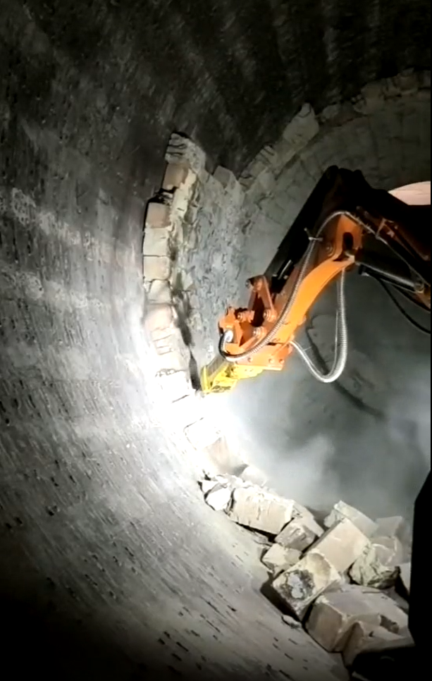 2、液壓錘沖擊力高,能輕松拆除窯口澆筑料和硅莫磚。相比較小挖改裝的設備,隨機配置的ATLAS液壓錘沖擊力大,沖擊功可以調(diào)整。